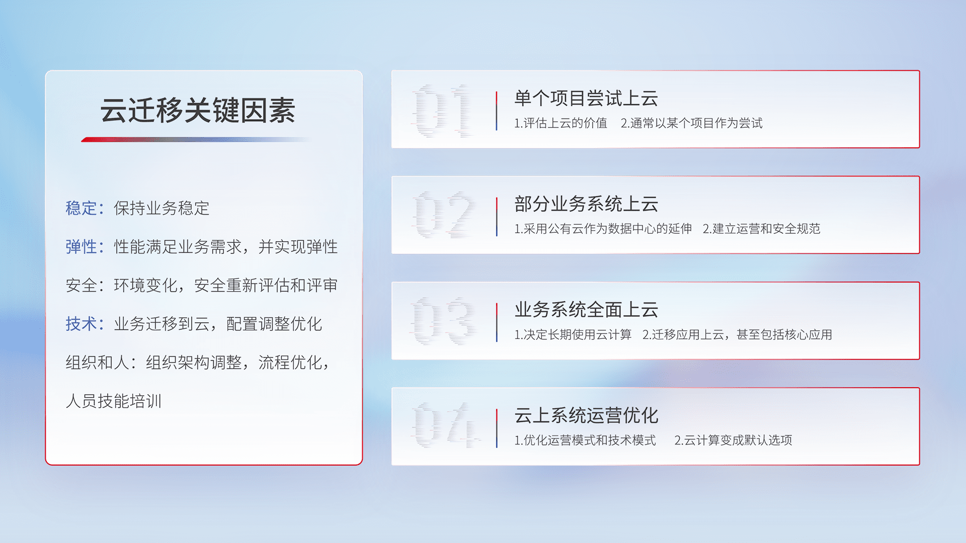 结合实际业务,,从规划设计、、、云平台选型、、、、云原生改造、、、数据迁移、、、、集成交付,,迁移全过程为客户识别最佳上云路径,,做好风险识别管理,,,,设计网络架构、、身份权限、、安全审计合规、、、操作审计、、、日志审计、、、、监控告警策略、、多站点容灾设计等,,对云上基础设施进行整体规划,,,提升IT治理水平,,,以满足弹性、、、高可用、、、、高性能的需求。。。。