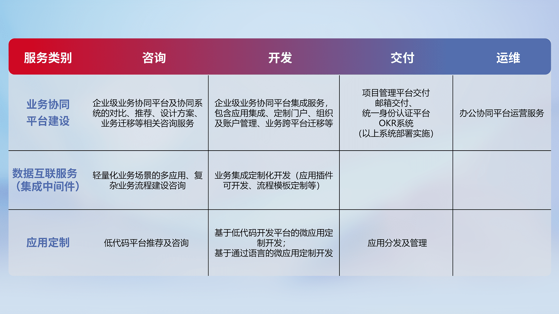 针对钉钉、、、企微、、IDaas等平台级产品提供产品的规划、、、方案、、交付、、、定制化开发等服务,,实现如统一协同办公、、智能客户服务、、、混合会议管理、、、、智能数据查询、、、等业务场景,,,,实现数字化转型。。。
